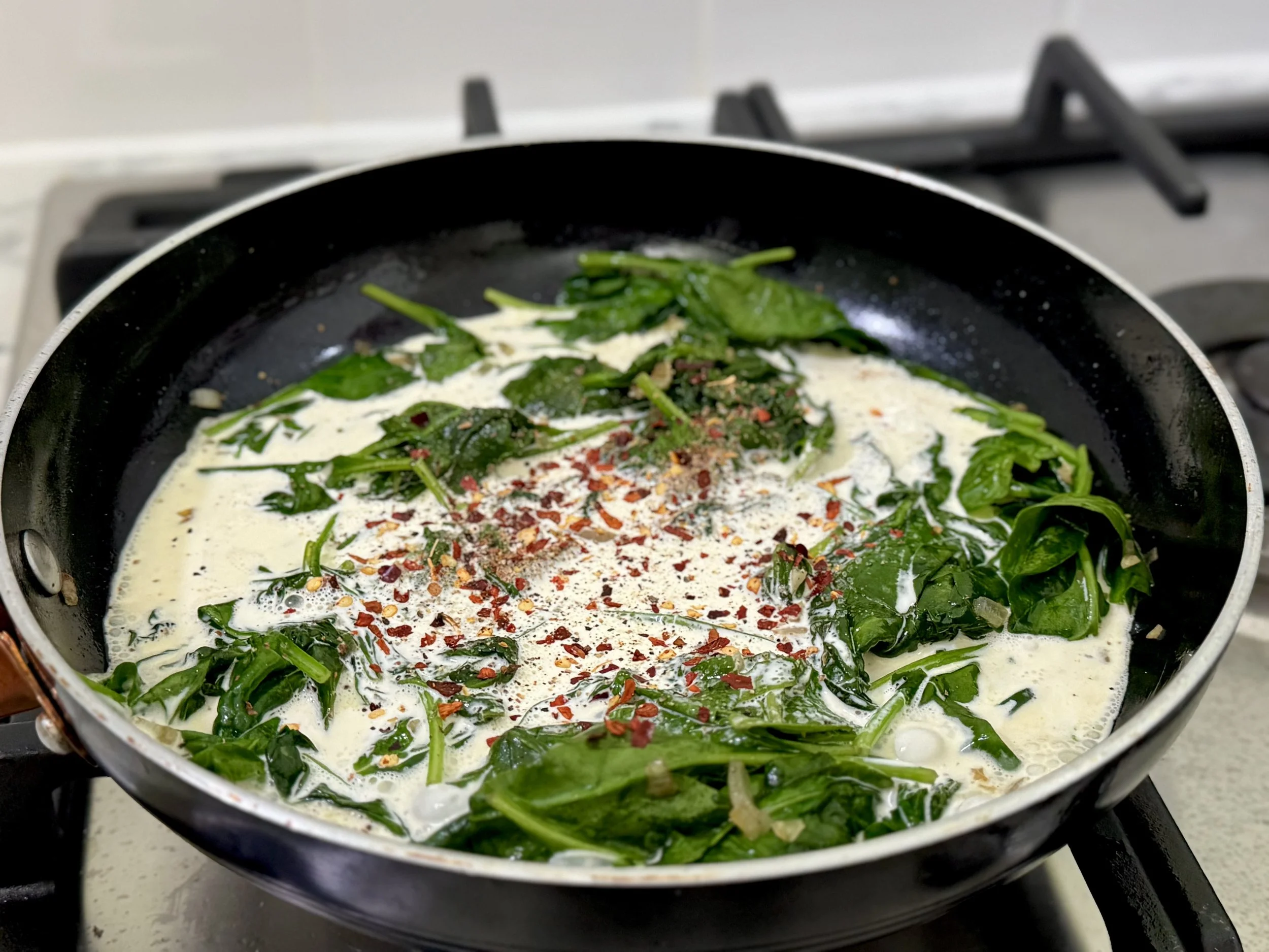Heat olive oil (or oil + butter) in a non-stick pan over medium-high heat. Place salmon skin-side down and cook for 3–4 minutes. Flip and cook the other side for 2–3 minutes until golden and cooked through. Set aside.Creamy Spinach: