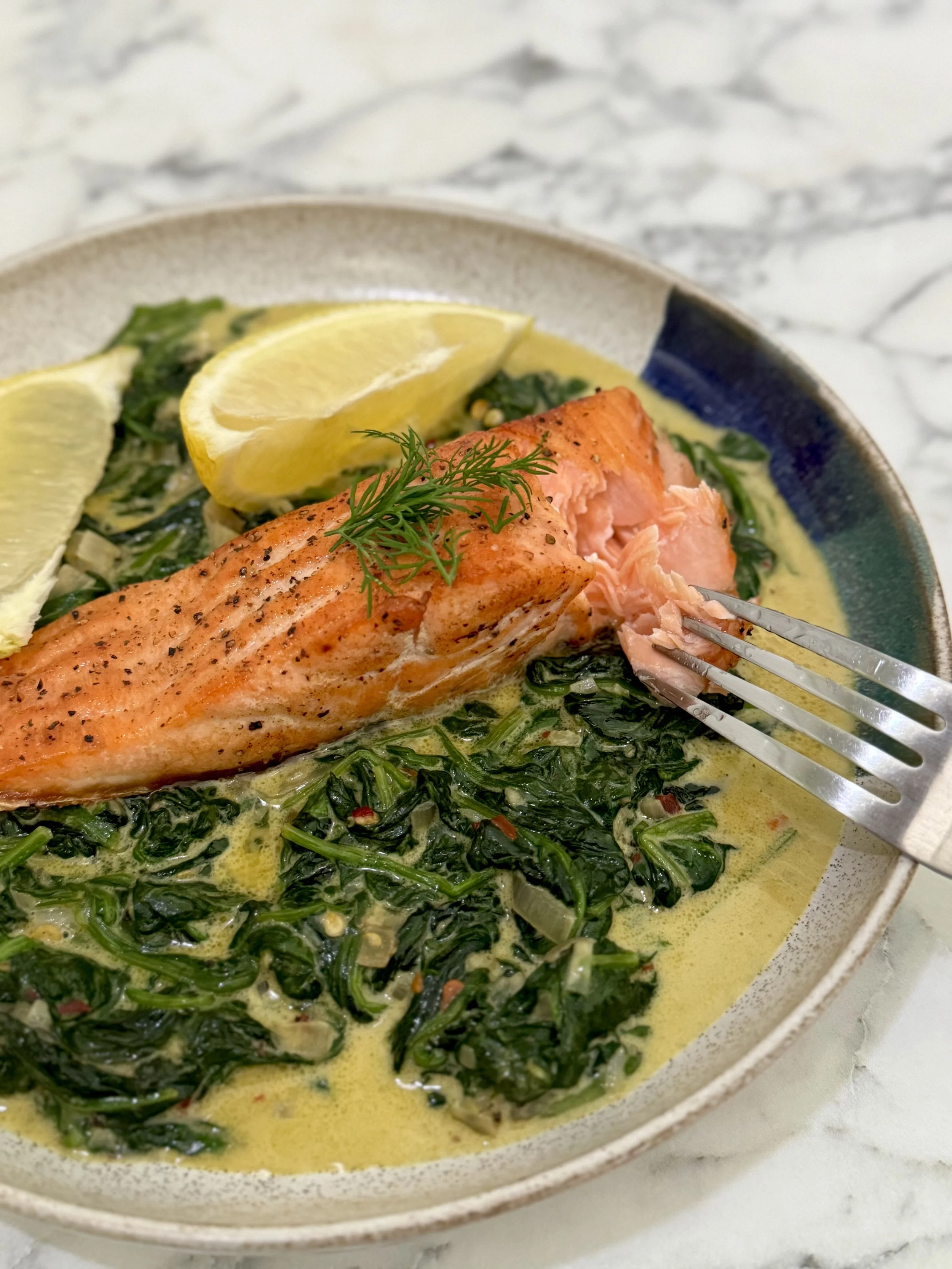 This creamy spinach and pan-seared salmon dish is quick, satisfying, and makes you feel like you’ve got your life together, even if you’re cooking in your bonnet.